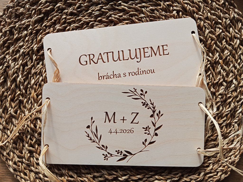 Dřevěná obálka na peníze je vyrobena z kvalitní překližky a precizní laserové gravírování jí dodává osobitý charakter – lze jej přizpůsobit jmény novomanželů, datem svatby nebo krátkým věnováním.