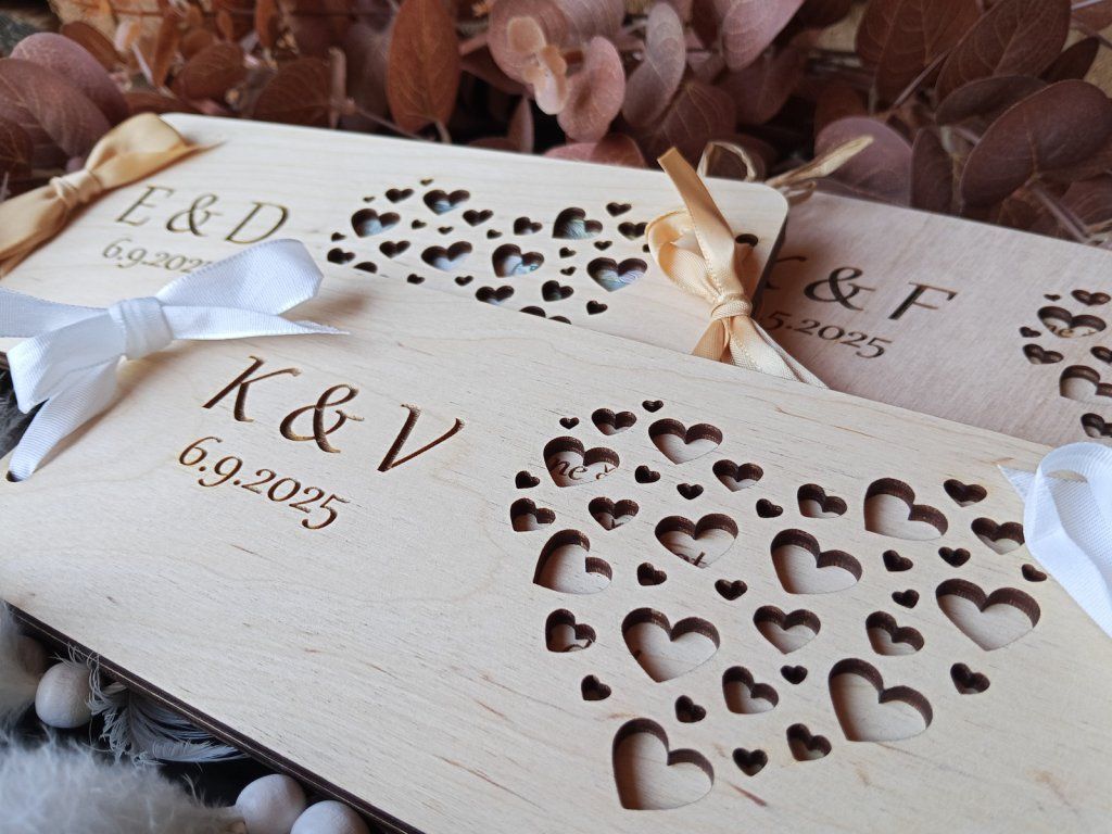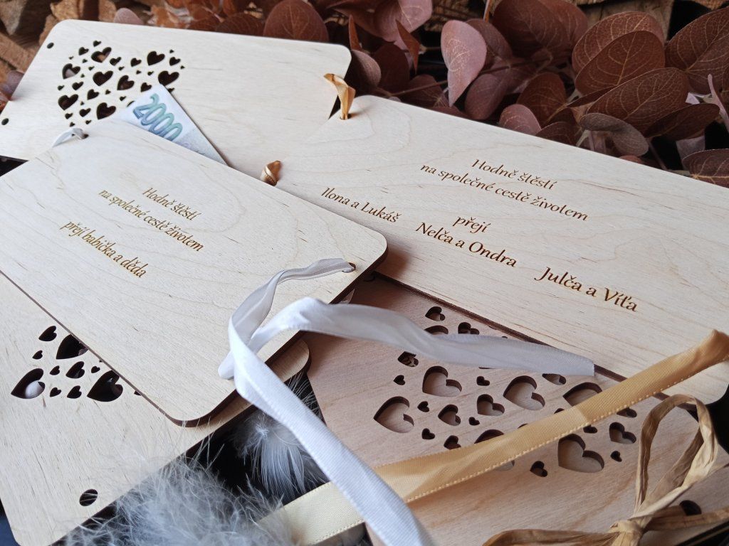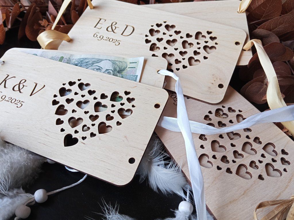 Originální dřevěná obálka na peníze vyrobená na míru. Originální přání ke svatbě. Precizní laserové gravírování jí dodává osobitý charakter – lze jej přizpůsobit jmény novomanželů, datem svatby nebo krátkým věnováním. Díky tomu se z obyčejného daru stává velmi osobní dárek.