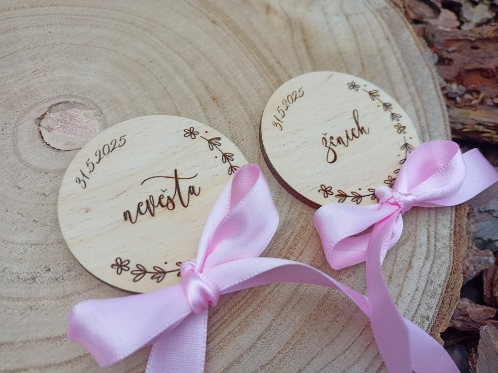 Každá jmenovka je vyrobena z kvalitní 4mm překližky, o velikosti 7x3 cm, se saténovou stužkou a je gravírována jemným motivem, který podtrhne romantickou atmosféru vaší svatby. Personalizovaná jménem každého hosta, stane se milou památkou, kterou si rádi odnesou domů.