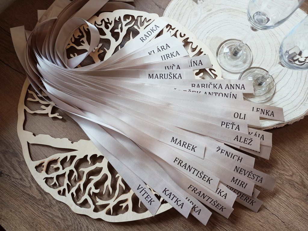 Personalizované stužky využijete jako jmenovky na svatební tabuli, ozdobu ubrousků, skleniček, svatebních výslužek nebo dárků pro hosty. Jsou nejen praktickým prvkem organizace zasedacího pořádku, ale také krásným detailem pro svatební fotografie.