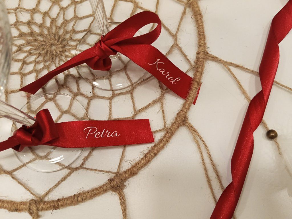 Personalizované stužky využijete jako jmenovky na svatební tabuli, ozdobu ubrousků, skleniček, svatebních výslužek nebo dárků pro hosty. Jsou nejen praktickým prvkem organizace zasedacího pořádku, ale také krásným detailem pro svatební fotografie.