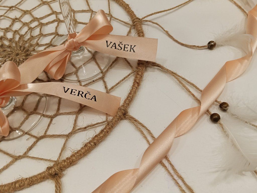 Personalizované stužky využijete jako jmenovky na svatební tabuli, ozdobu ubrousků, skleniček, svatebních výslužek nebo dárků pro hosty. Jsou nejen praktickým prvkem organizace zasedacího pořádku, ale také krásným detailem pro svatební fotografie.