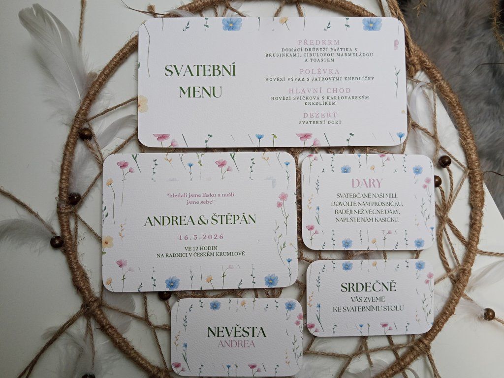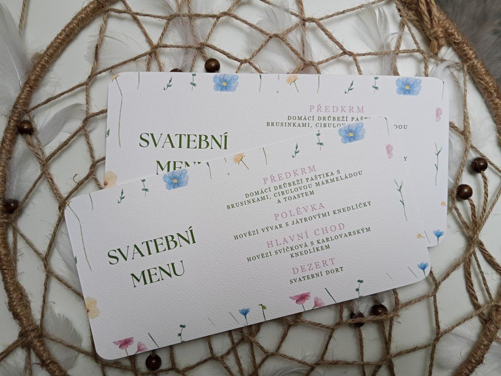 S našimi tištěnými svatebními menu kartičkami uděláte z každého chodu malý zážitek a hosté si budou vaše menu pamatovat nejen díky chutím, ale i díky stylovému provedení. Přidejte do své svatební hostiny eleganci a přehlednost.